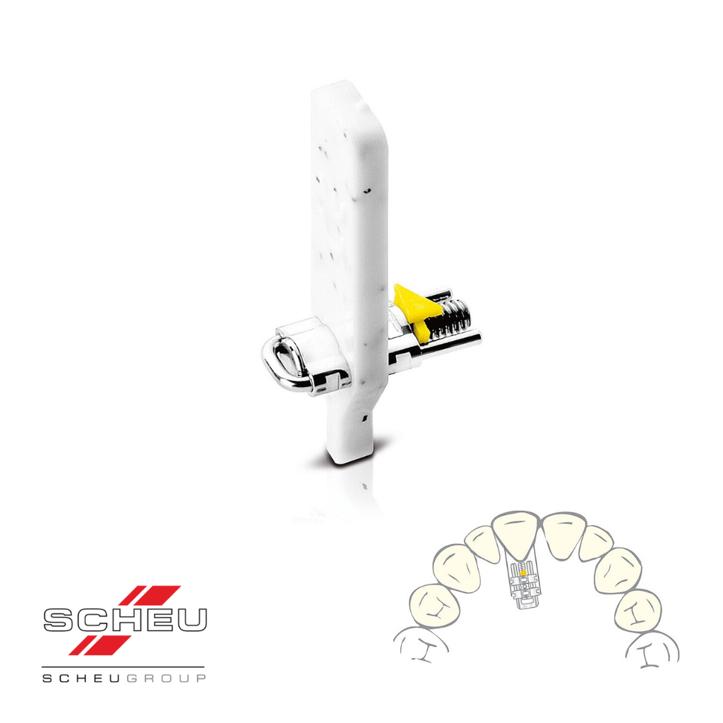 Skeletal miniaturised sector expansion screw with bright yellow directional arrow for single tooth and segment movement in the upper and lower jaw.